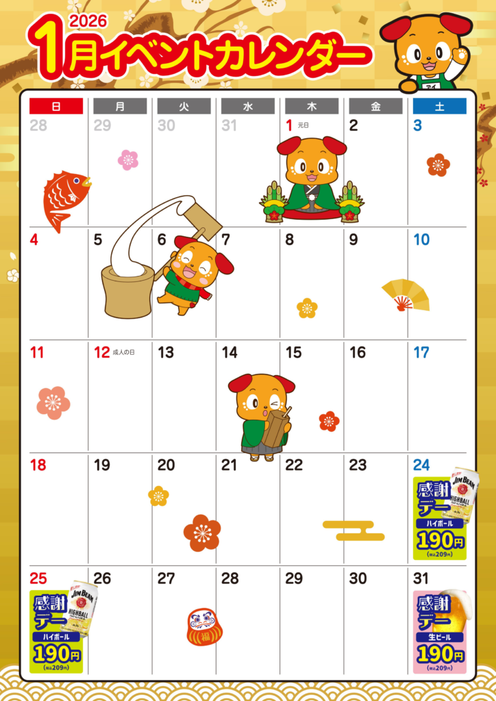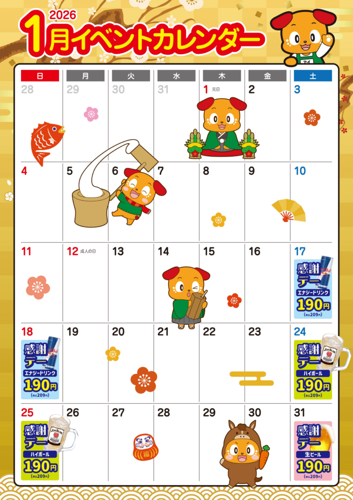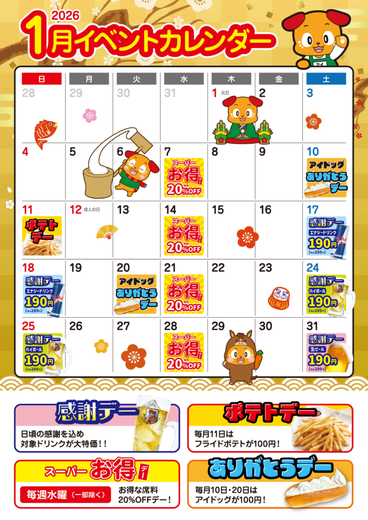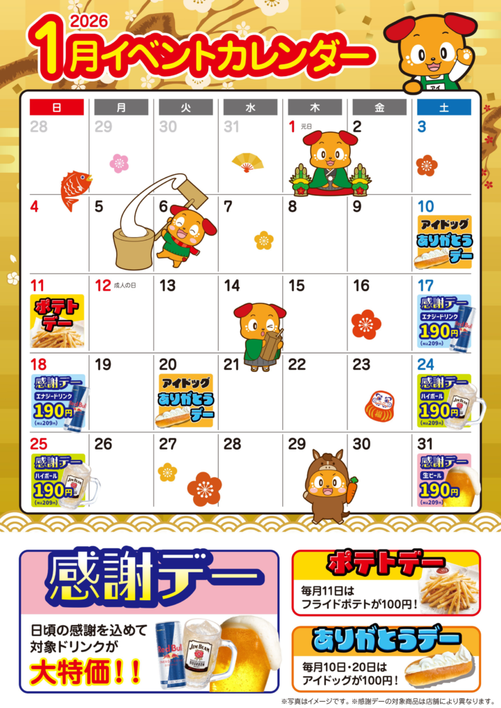 2026年1月は、「アイドッグデー」や「ポテトデー」をはじめ、お得なイベントを開催予定です。