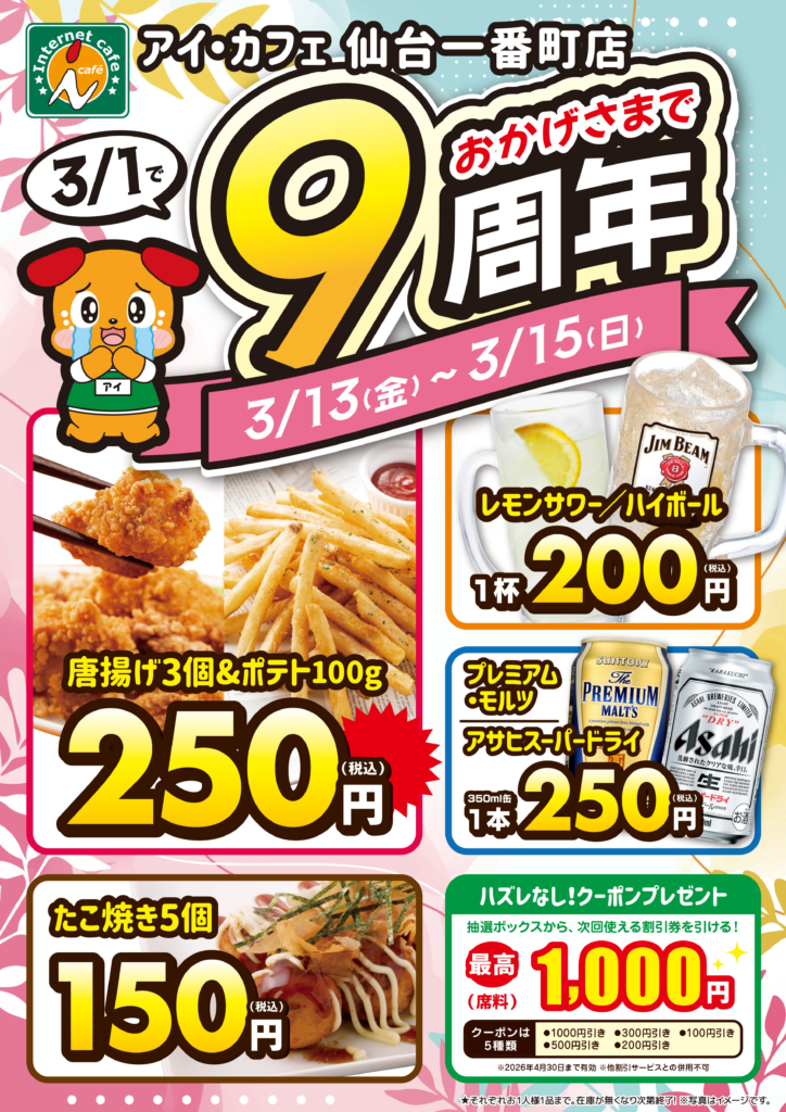 アイ・カフェ仙台一番町店「9周年記念キャンペーン」開催!